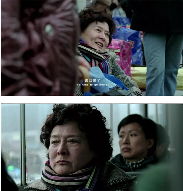 影片尾声,阜阳保姆们上了破旧的公交,准备回乡返程。一位阿姨从远处跑来,操着方言让车上的同乡捎一个用红布包着的盒子回老家。是骨灰盒。