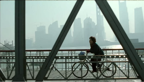 这是谢琴在大桥上骑车的一个镜头。人很渺小。